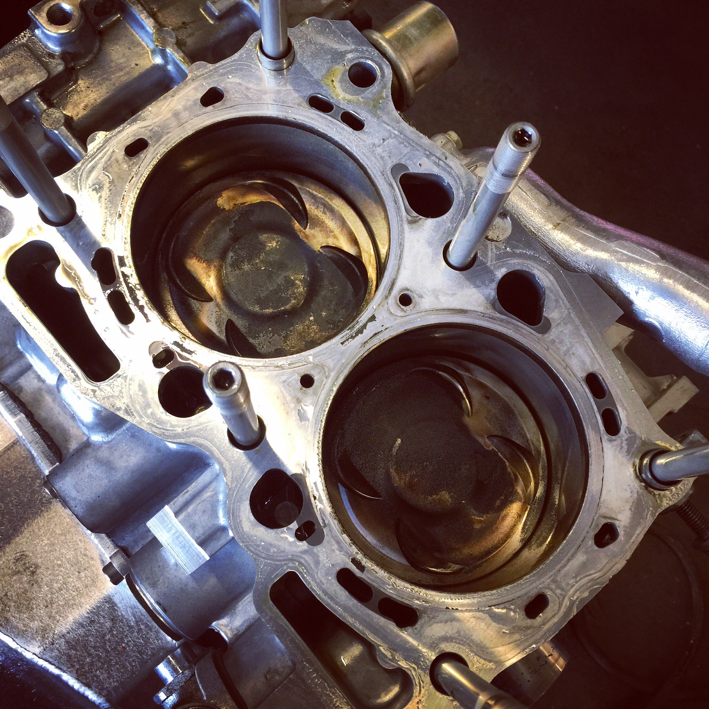 With the transmission pulled the decision then came to pull the motor and send it to Outfront Motorsports to evaluate the condition. An interesting piece of usual Forum talk is about the use of GSC cams and there wear on different items in the head. Lets just say that it appears to be just another form of some of the usual garbage that you find on the forums from guys that improperly installed or broke the new parts in. Now GSC Power Division is producing Billet cams for the EJ series motors as well as many more. My JE Pistons, Scat Crankshaft and JE Pro Seal head gaskets all looked perfect.