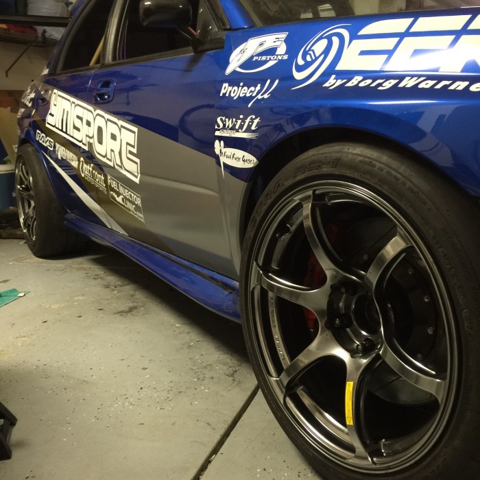 Now one of the largest upgrades the car will see is a larger set of wheels and tire and being that I wanted to use a set of wheels that will be able to withstand the abuse from berms and dropping tires which is why I called up Mackin Industries and got a set of 18×10.5 +25 Yokohama Advan RGIII’s. Besides the fact that they are astonishing to lay your eyes upon they are some of the strongest wheels available. They are going to allow for the use of tires ranging from 275-295.