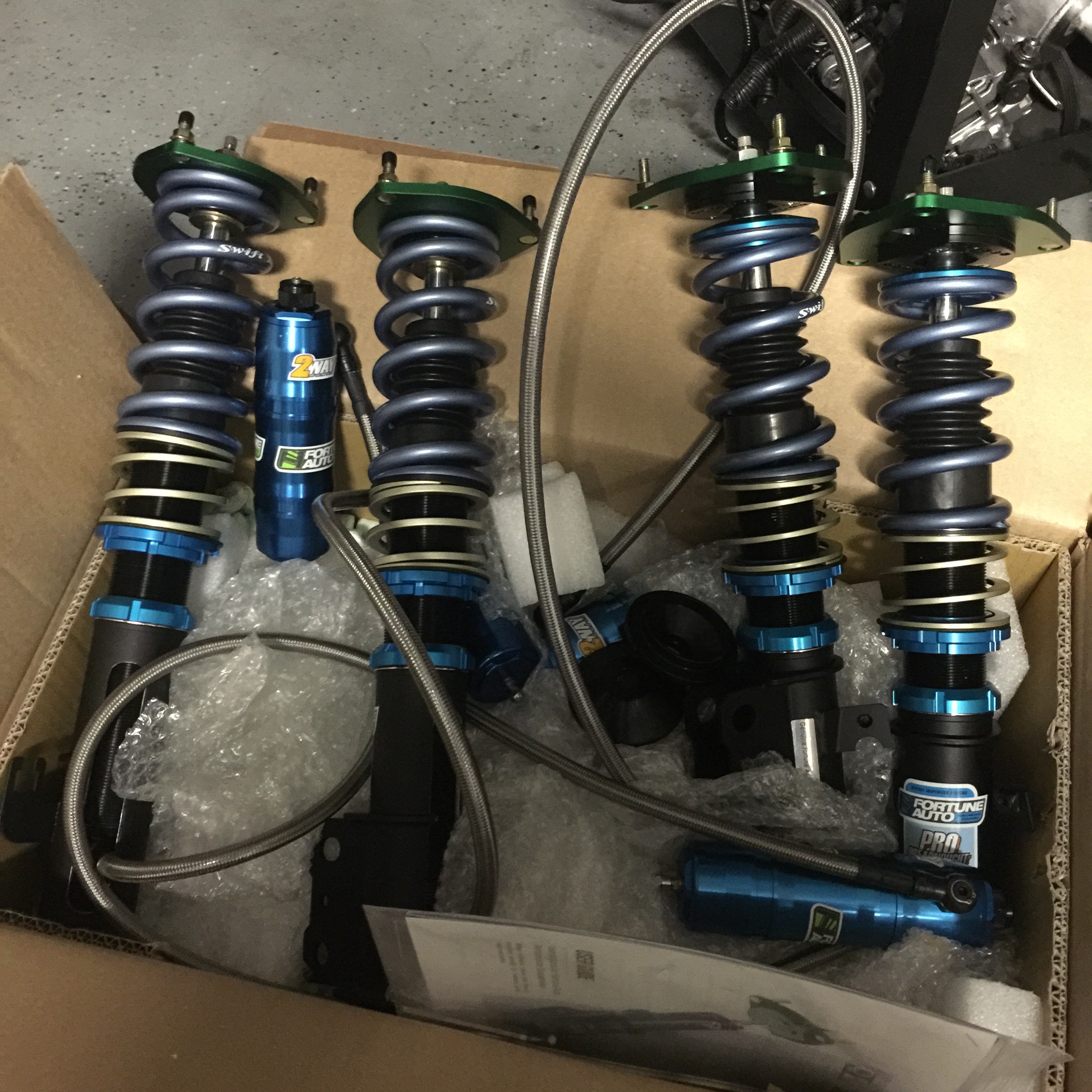 Now that we had the car looking as ragged as possible with perfect timing our new Fortune Auto Dreadnought II coilovers arrived which allowed us to put them on and check fitment. These 2 way coilovers are hand built and made to our spec, they also come with a complete shock dyno graph. Also coming with them are our Swift Springs and their helper springs, although we do plan on doing some changing to find the perfect setup but these will be a great start at 13k all around.