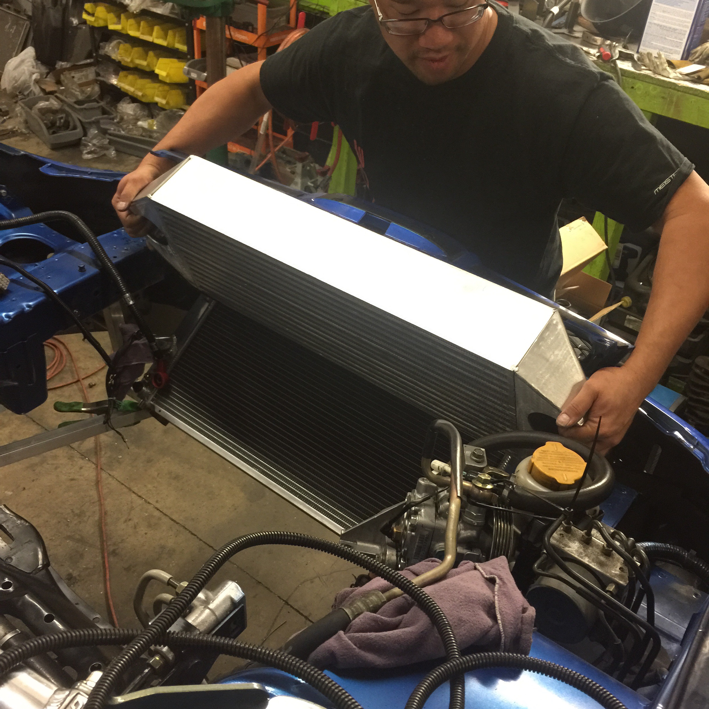 Paul had his hands full literally working on fabrication on the front of the car and the rear of the car as well as everything and anything in between. Here you see him test fitting the FMIC in a location that most people do not quite see it. You might notice that he has already welded on custom end tanks and is setting up to figure out how to mount it and a few other items along with it.