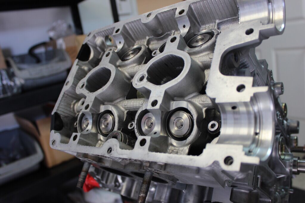 The short block came assembled from Outfront with a Scat Crankshaft, ACL Bearings, Manley turbo tuff rods, and JE Pistons. We were very excited to get it in the car and crank it over for the first time but first we had a lot of assembly to do. Gil and Oscar got started by assembling the heads that SoCal Porting did an amazing job making sure we would be able to flow as much as possible! They then started to add the Supertech Valvetrain and GSC Power Division S2 cams.