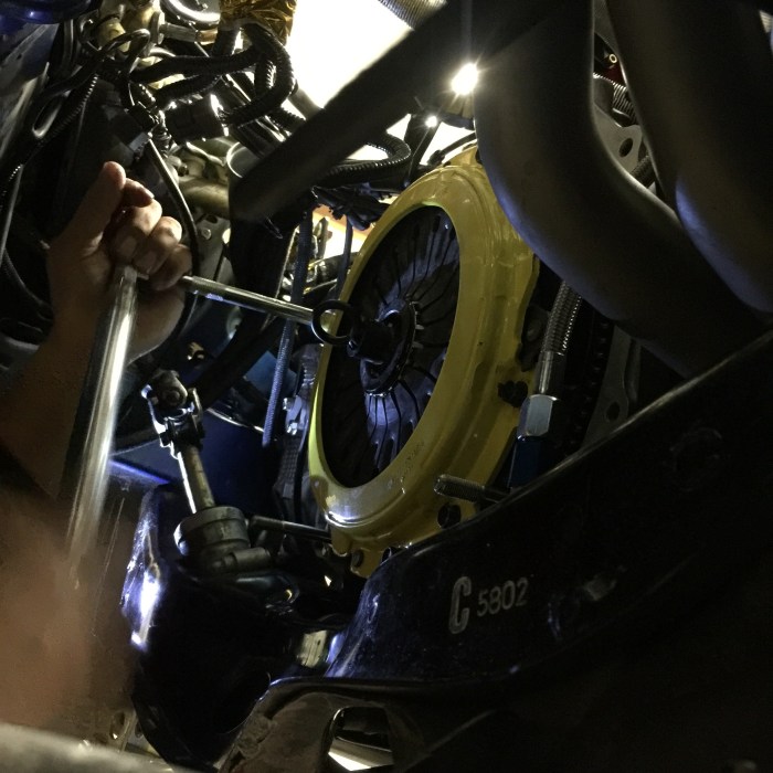 Now one thing that I neglected to mention in the last article was that when we went to install the second motor into the car he weekend before SLB between the rush and the lack of sleep a plug on the back of the motor was forgotten and on startup it released the fury of oil hell onto our ACT Clutch. Now we thought we might of been able to get away with just cleaning the clutch disc and reinstall it but it wasn’t the case. Although we did not find this out until the day before SLB when Paul was able to get the car on the dyno…..