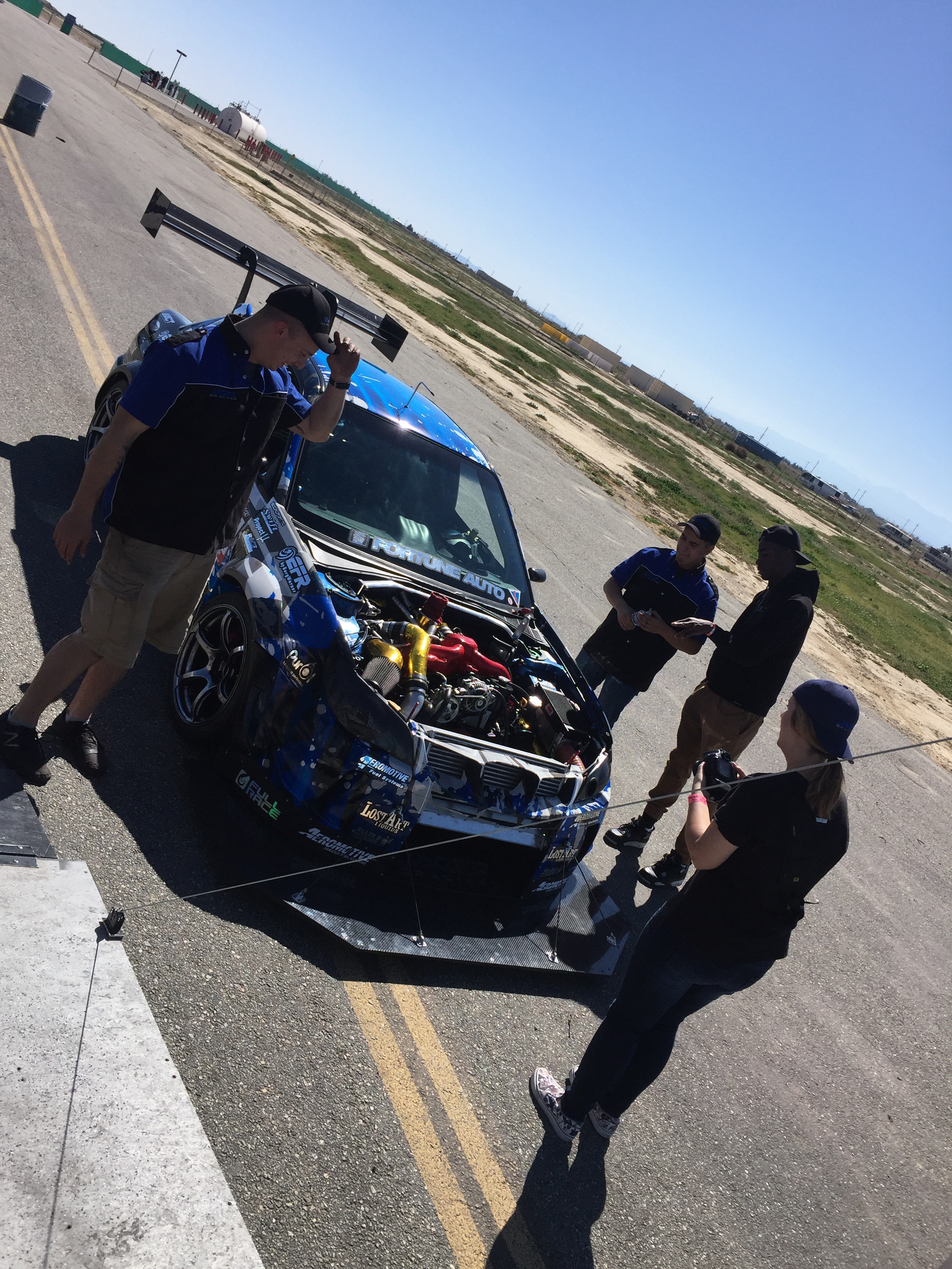 Then we went out for the first Time Attack session, now at this point we were feeling pretty good about the car and its abilities. But one thing started to come up, for some reason we started to lose boost. After another practice session we noticed on the log that we were 8psi down on boost and we started looking for trouble. Ken was able to figure out that we had 2 of our 4 uppipe studs go missing which was letting the exhaust escape before reacting the turbo causing us to lose boost pressure. Now there was only 3 problems first we only had about15 minutes before the final Time Attack session of the day, second being we did not have any spare studs, and 3rd it is a bit difficult to get to that area. So we did what anyone else would do, just tight the hell out of it all and hope for the best.