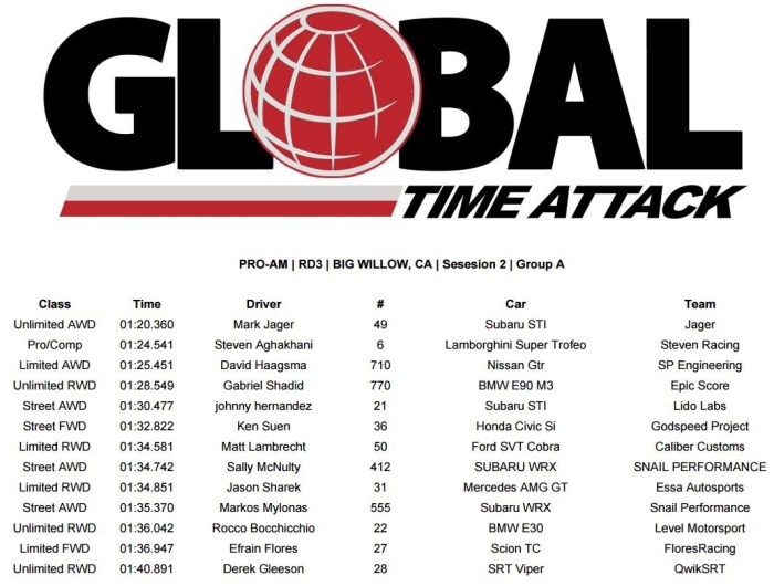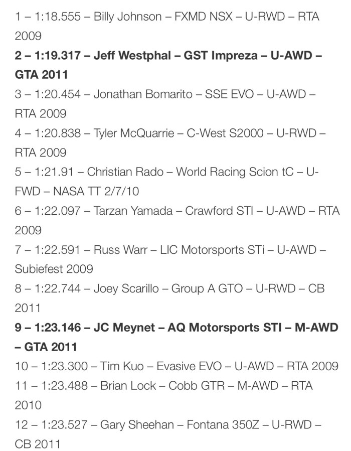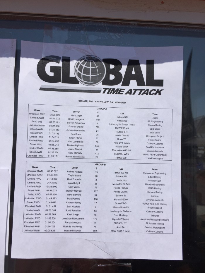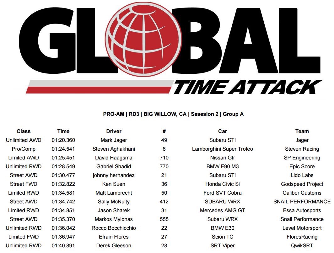 Our first session of the day let us know what we already believed, that the car has some serious potential! We posted a time of 1:20.626 which at Big Willow is a very quick time to say the least. The AWD Unlimited Class record is set by GST Motorsports at 1:19.317, a few times aren’t on the list below including the Lyfe Motorsport 1:20.xxx and my own Mod AWD Record of 1:23.129. But it is an absolute honor to be on that list next to names such as those!