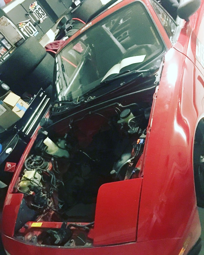 I went to work on the little Miata; First I took a spare race seat I had laying around and mounted it to the floor so that I wasn’t looking over the windshield. After that was established the most important part was next, a reliable engine. I picked up a used 1.6L from my friends over at Indotech Motorsports. I quickly ripped out the stock engine which may or may not have had 300,000 plus miles and swapped in the new/used motor.