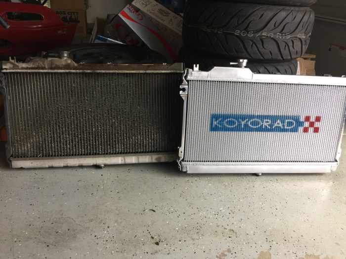 The next item I picked up was a Koyorad Radiator to ensure my track day fun stays fun and not sitting around waiting for a tow truck. Plus as you can see by the stock radiator below it sure looked like it had about 300k on it. I honestly can’t figure out if the radiator just stopped flowing or if it was the faulty fan switch that was the poor little Miata’s demise.